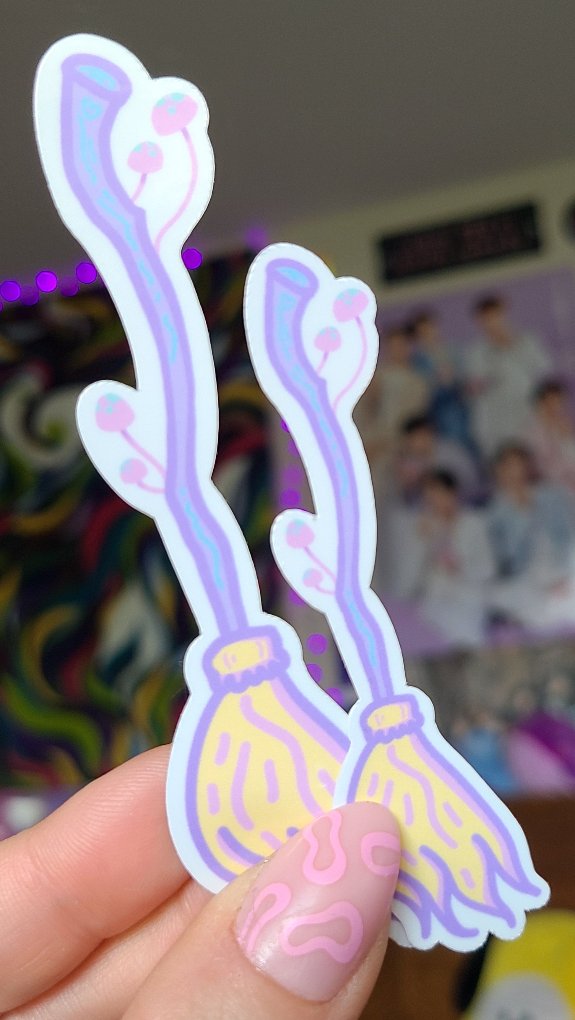 Give your belongings a magical touch with our Broomstick Vinyl Sticker. The whimsical design of a witchโs broomstick will sweep out negative energy and make room for new growth and healing. Its pastel colors and mystical vibe add a touch of cuteness to any item it's placed on.๐๐งน