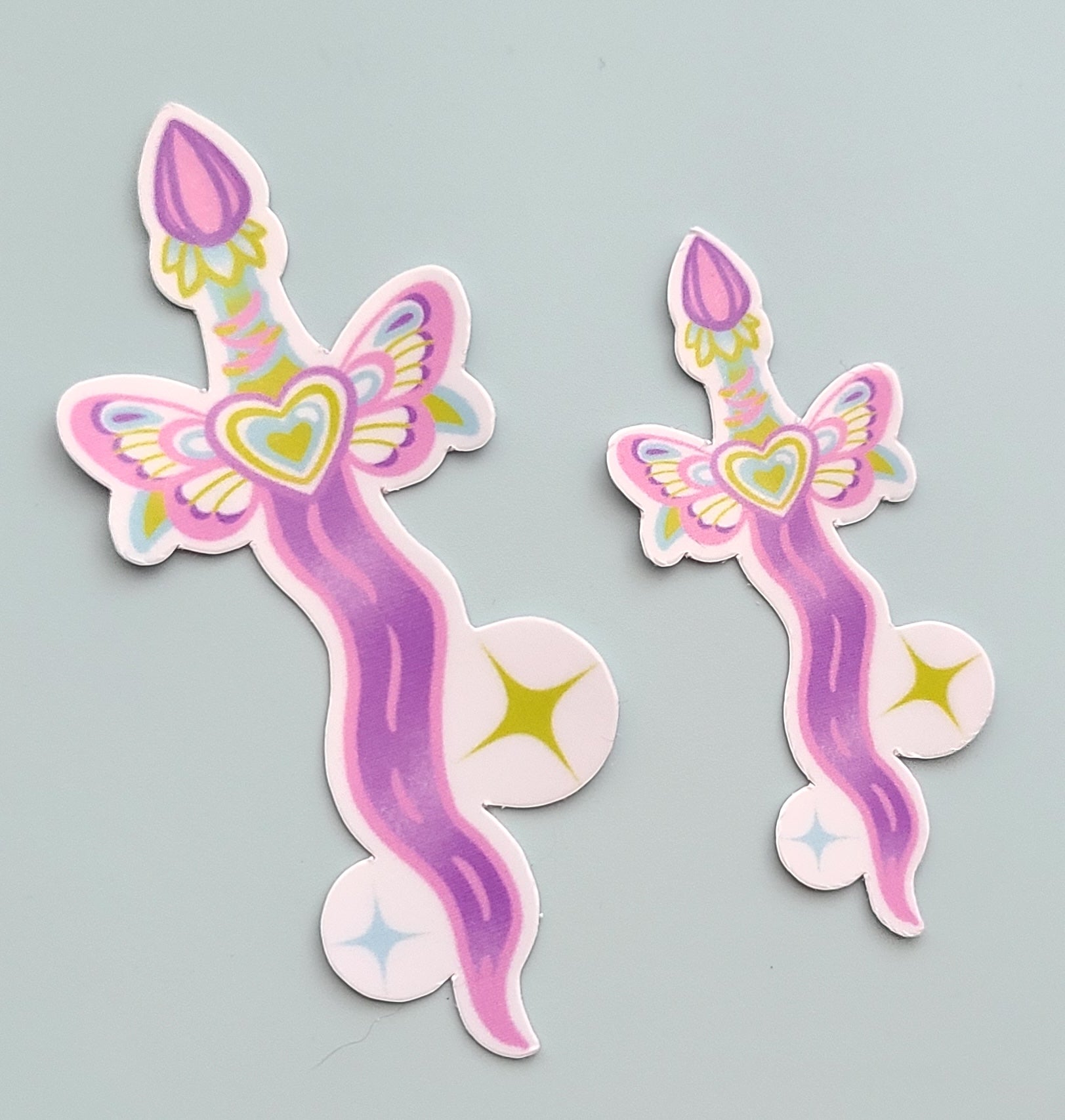 This Cute Butterfly Dagger Vinyl Sticker offers a charming blend of sweetness and edge through its delicate yet dangerous design complete with butterfly hilt.