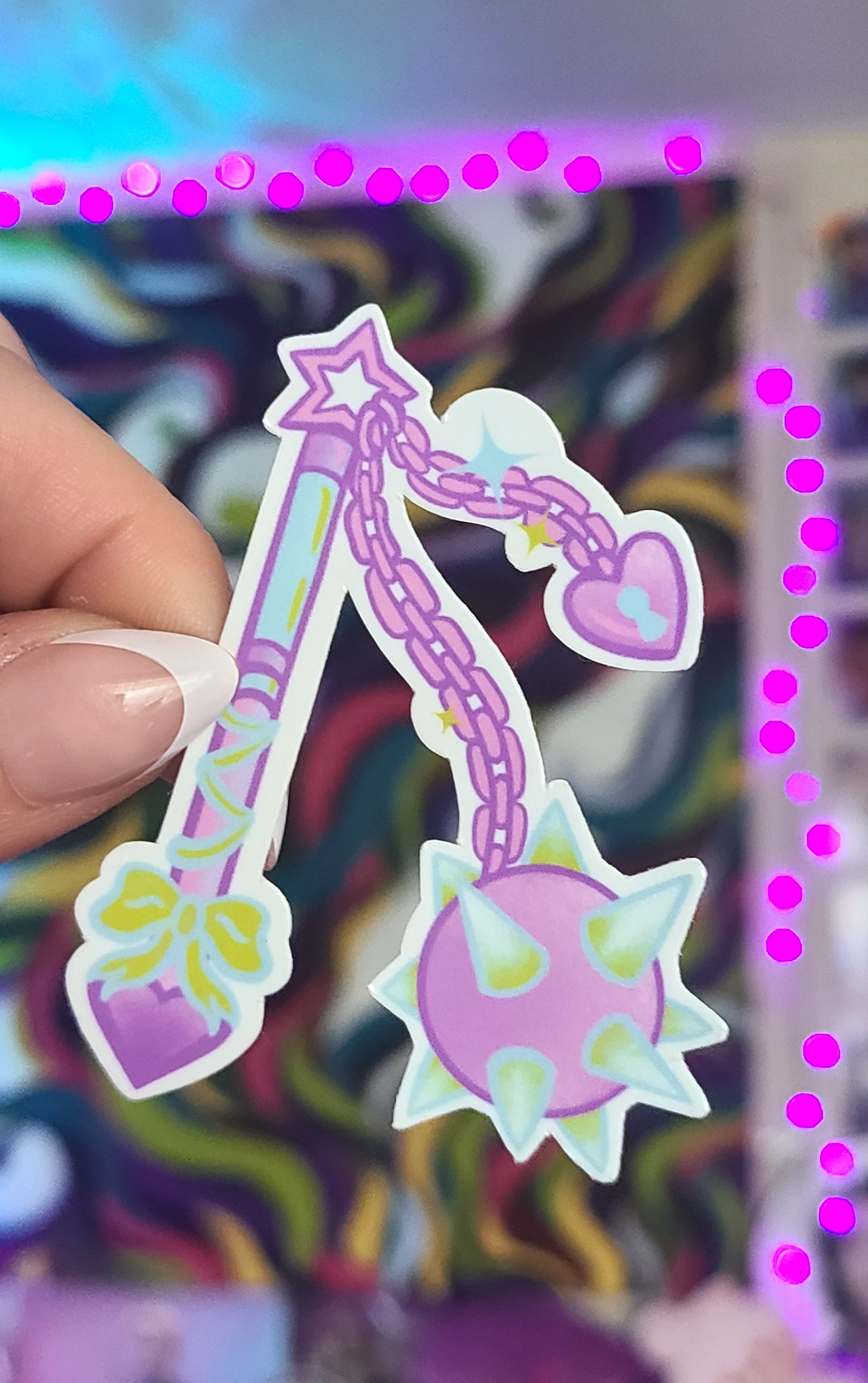 This Cute Star Flail Vinyl Sticker features a charming, spiky ball full of playful energy. It has a heart-shaped handle decorated with a vibrant green bow, crowned by a star and finished with a heart-shaped lock for an extra touch of sweetness 💜