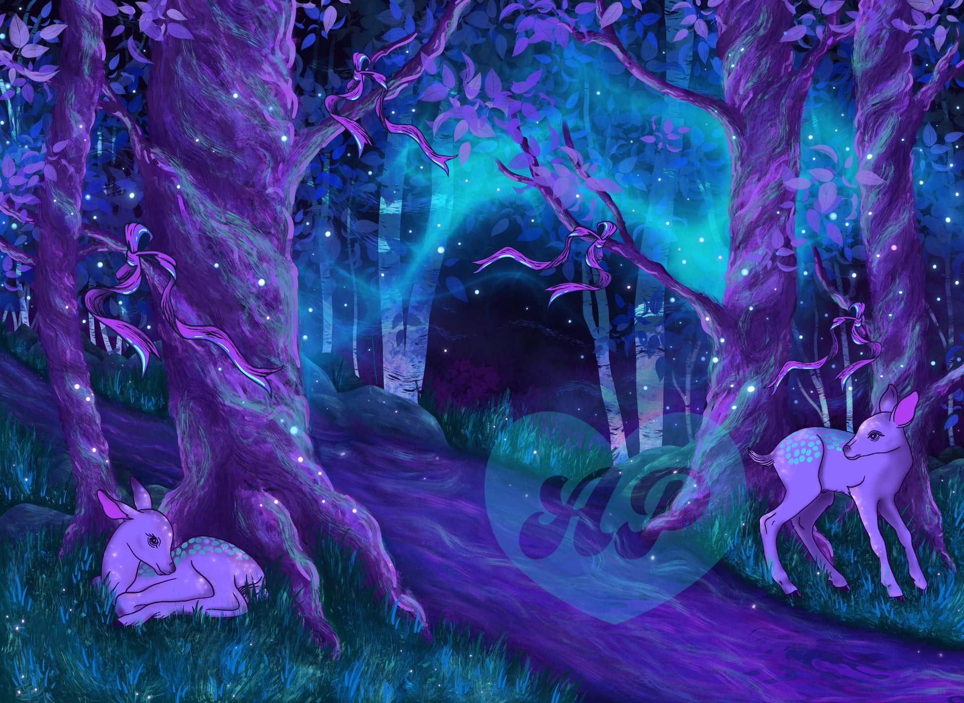 Created with deep reverence for my Lakota and Cherokee heritage and grief for our missing and stolen sisters, this enchanted forest scene depicts fawns gathered by a misty stream. I imagine them safe now and hope for healing for those left behind.