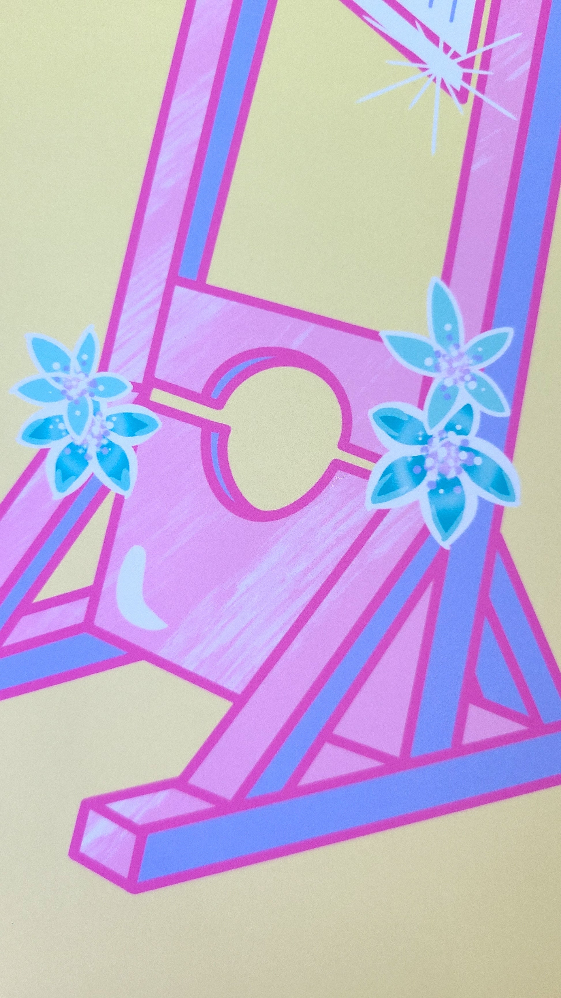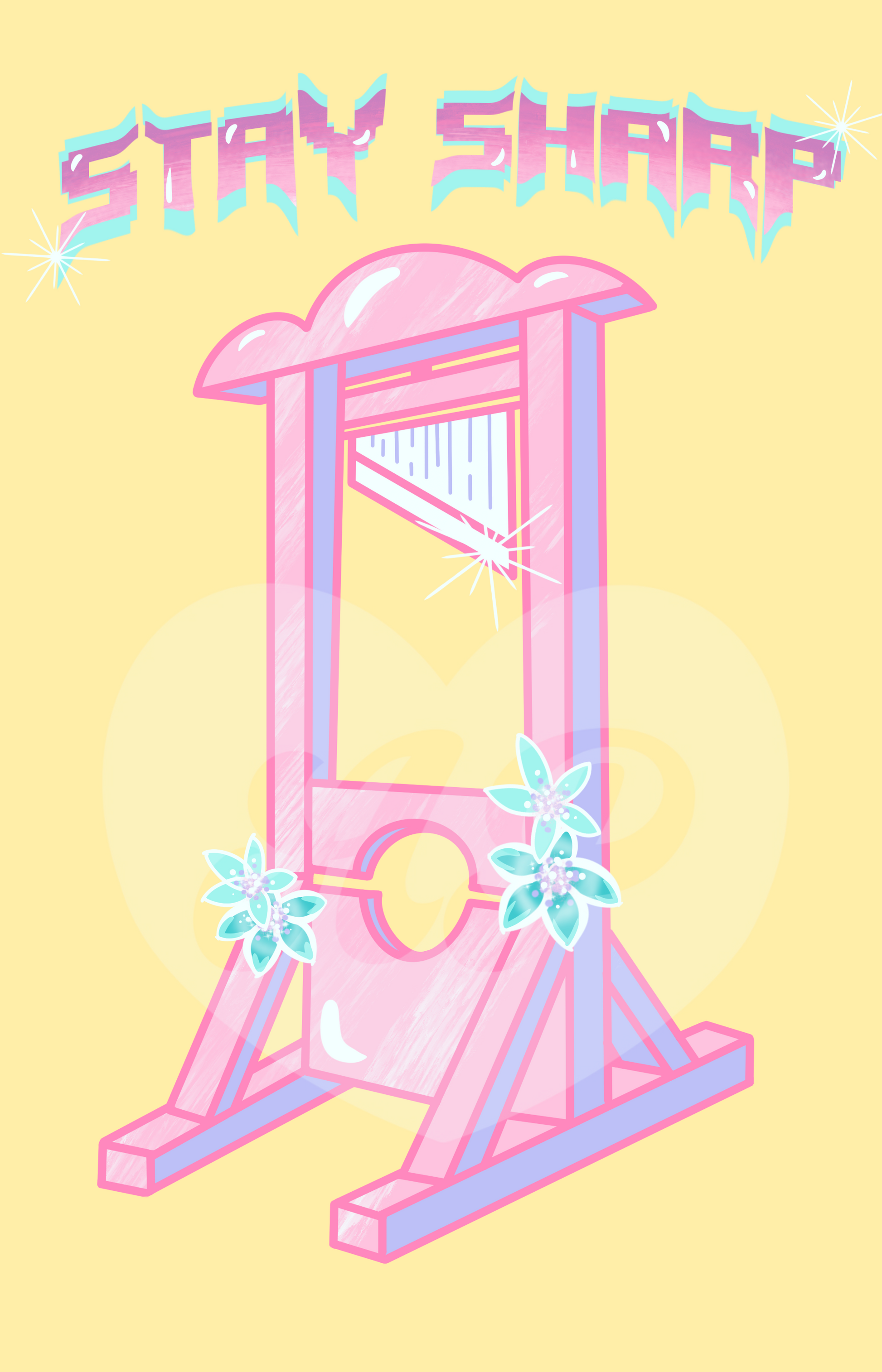 A nod to the French Revolution, this cute guillotine is adorned with delicate florals and a certain spark. "Stay Sharp" serves as a commitment to learning from history so we are not doomed to repeat it ✨